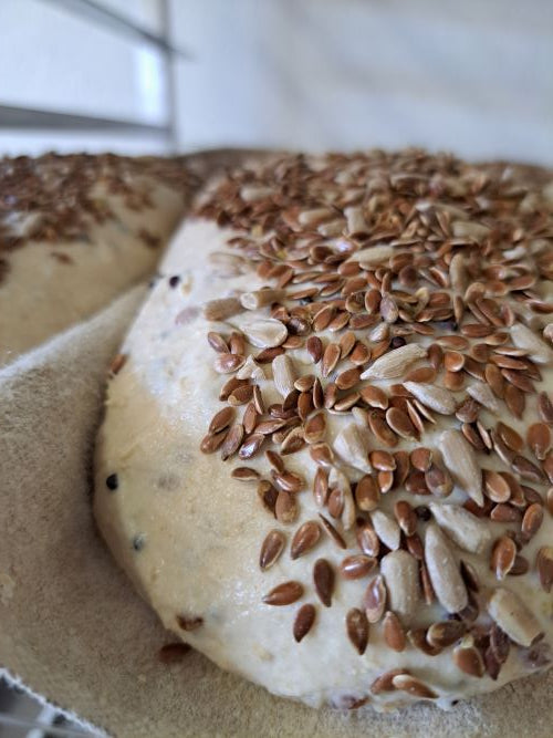 Notre pain au levain naturel est élaboré avec les céréales et les graines cultivées sur la ferme en agriculture biologique. Nos céréales sont moulues sur meules de pierre. En fermentation longue (plus de 16h), le levain va apporter du goût mais surtout prédigérer le gluten pour rendre le pain plus digeste.